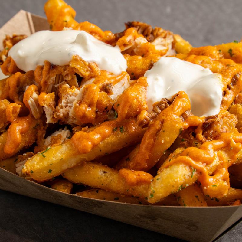 Fried chicken smothered in our house-made buffalo sauce, topped with bacon, bleu cheese sauce, and garlic aioli.